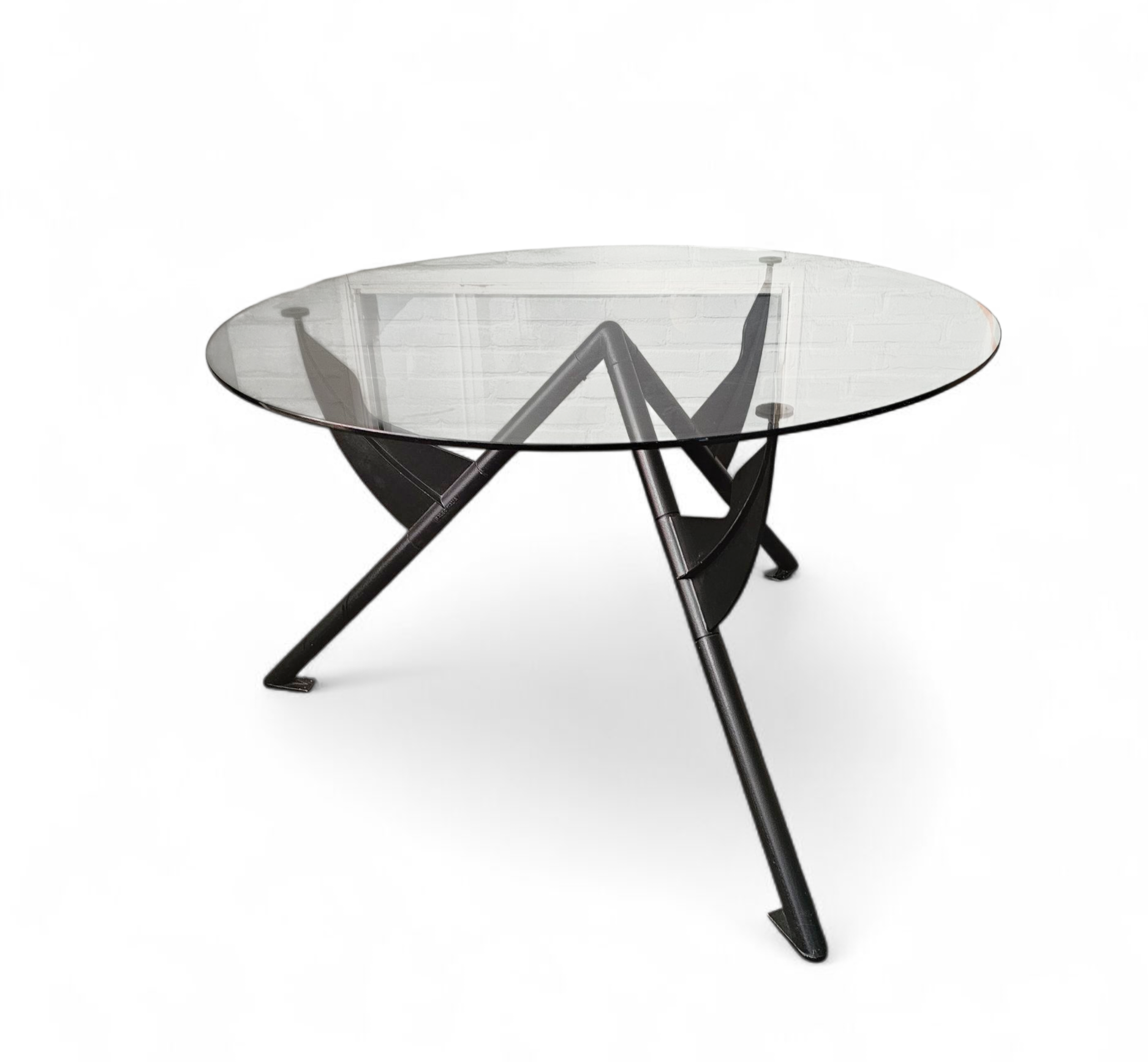 Designed by Philippe Starck in 1984 for François Mitterrand’s private office, the President M table stands out for its disassemblable structure and avant-garde design. Composed of three elements, its biomorphic aluminum legs, reminiscent of angel wings or fish fins, provide sturdy support to a floating glass top. This table merges striking visual impact with practicality, making it ideal for refined office or home settings.