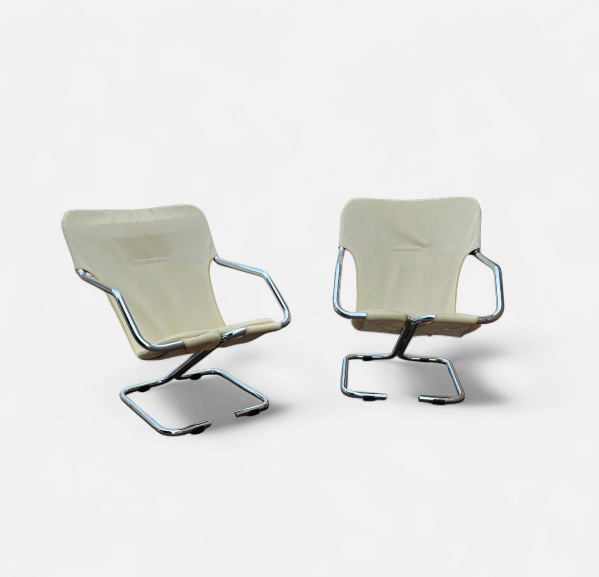 2 x Tubular chrome cantilever chair with a cream canvas sling