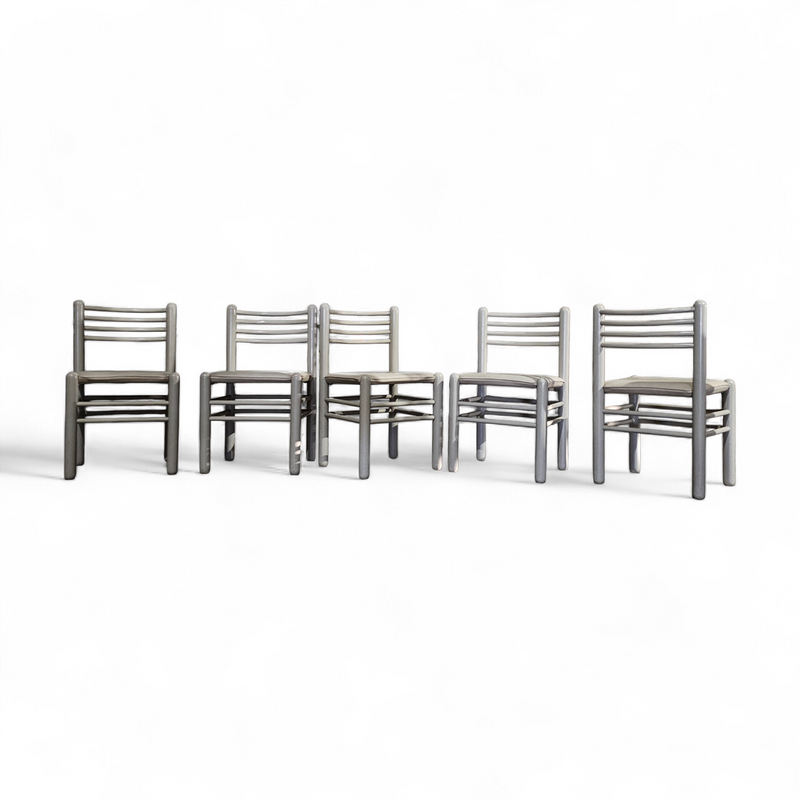 5 x dining chair / light grey wooden frame / leather seat / Germany 1970s / labeled " ideen für kuchen - innenarchitektur "