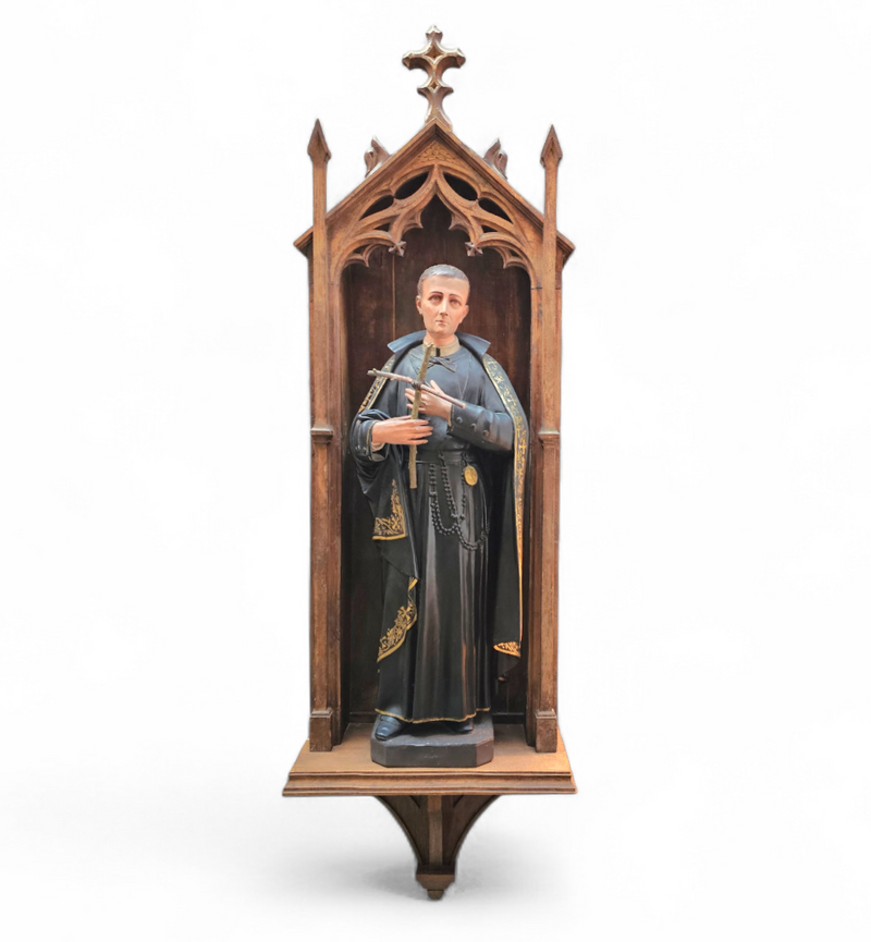Statue of a religious figure / Patron Saint Gerard Majella / placed in a Gothic niche / labeled /