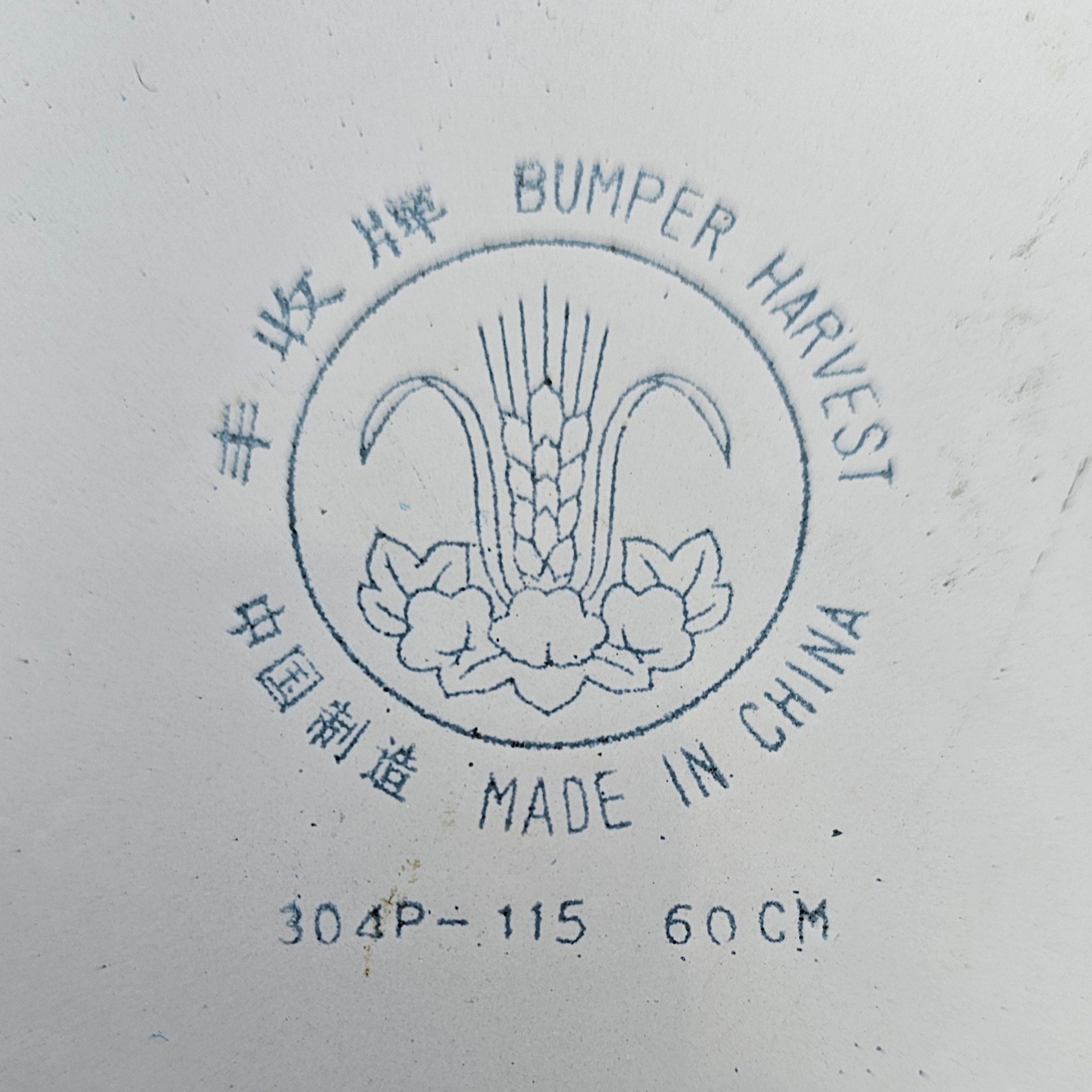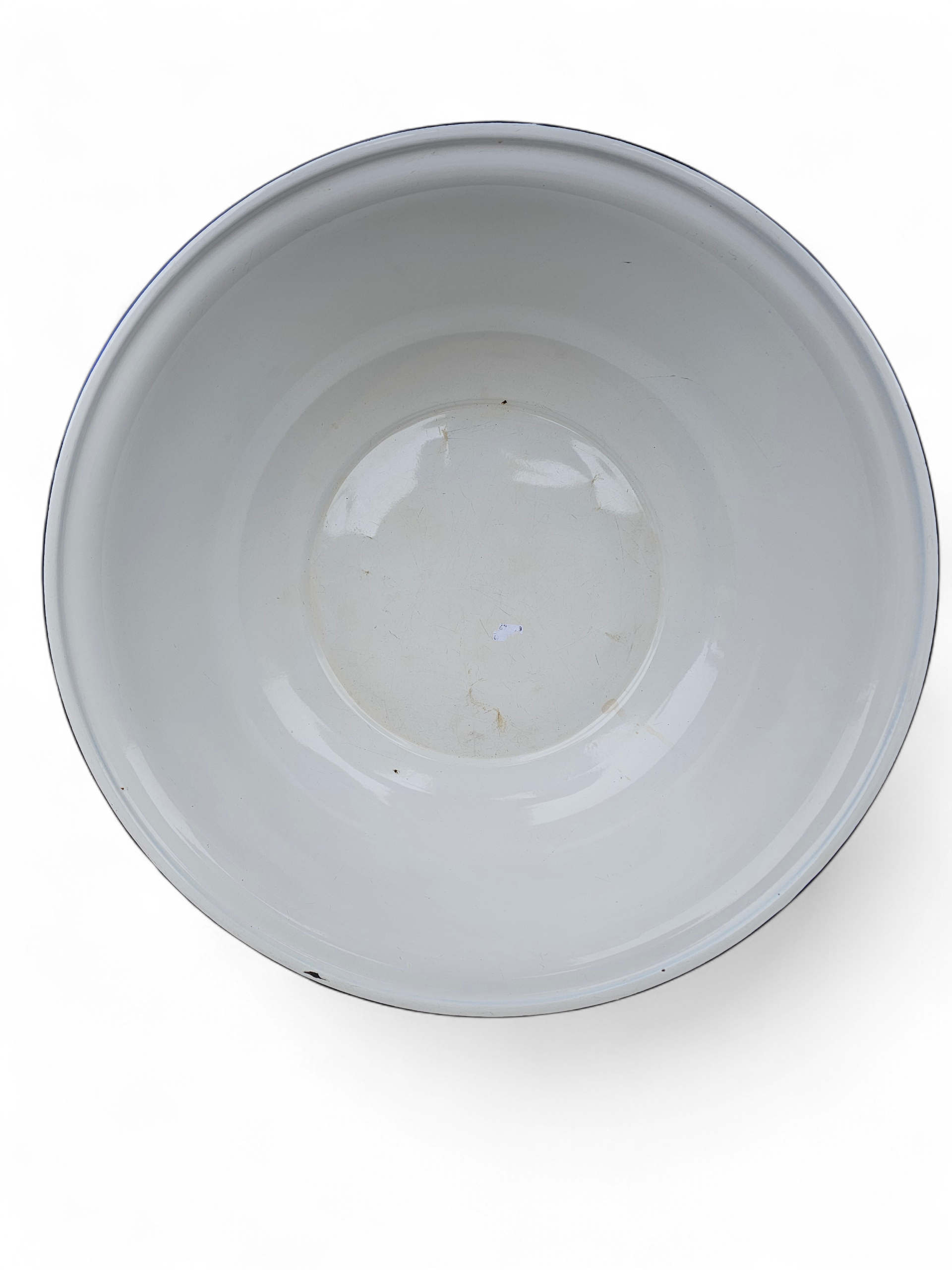 2 x large early 20th century deep enamelware bowl in white with a dark blue line around the lip circa 1920s / 1930s / Item has been used and does have signs / Bumper Harvest / China